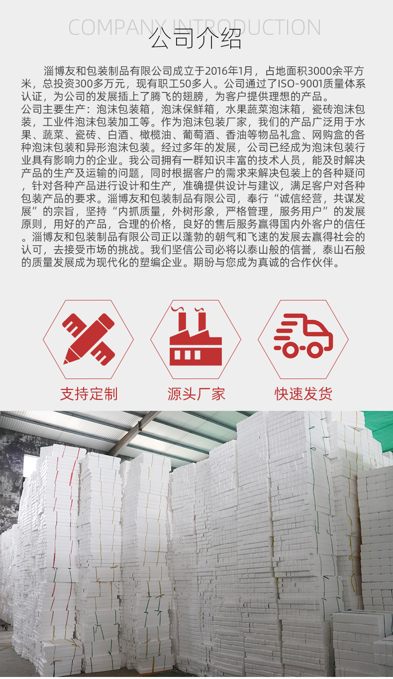 ????淄博友和包裝制品有限公司是專業(yè)的山東泡沫包裝箱加工廠家,本廠主要產(chǎn)品有:泡沫包裝箱,泡沫保鮮箱,水果蔬菜泡沫包裝箱,水果蔬菜泡沫保鮮箱,瓷磚泡沫包裝箱等,產(chǎn)品暢銷全國,深受用戶好評。泡沫包裝定做可以聯(lián)系我們網(wǎng)站 http://www.1113kj.com/ 上電話,我們會第一時間跟您聯(lián)系。